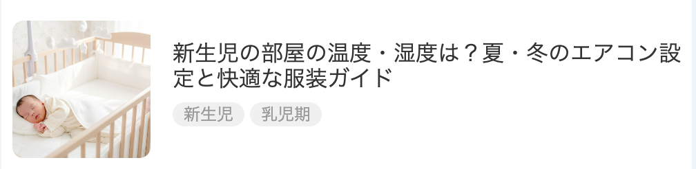 - 夏:メッシュ肌着 + 薄手ロンパース。冷房対策のレッグウォーマーを忘れずに。