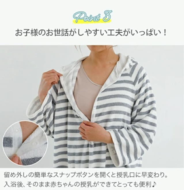 冬場の湯冷め防止に必須。前開きボタンタイプなら、着たまま授乳も可能です。