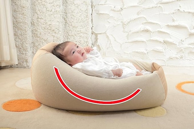 赤ちゃんの背中を、お腹の中にいた時と同じ「Cカーブ(丸まった姿勢)」に保ちます。ビーズクッションが体に密着するので、抱っこの安心感そのままで着地成功率が格段に上がります。 - ここがポイント